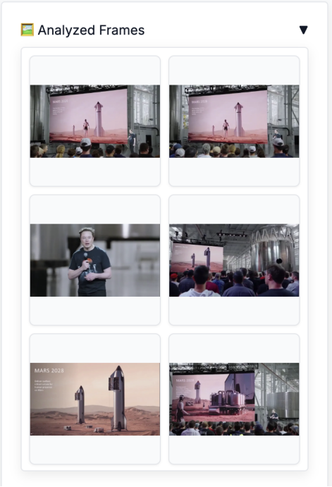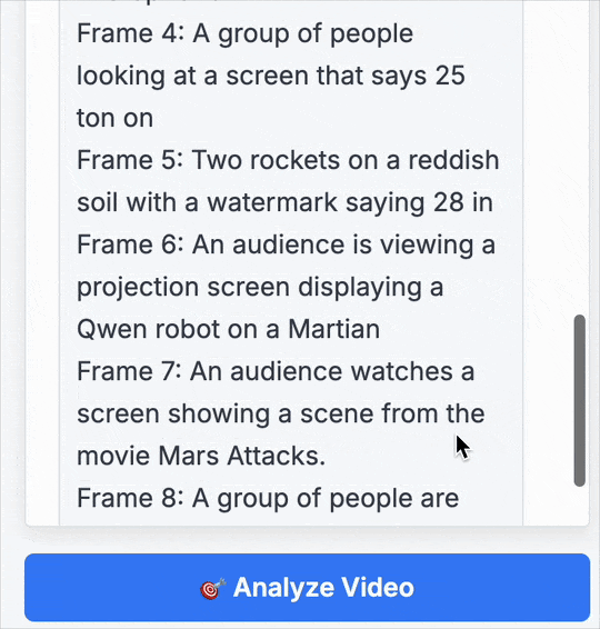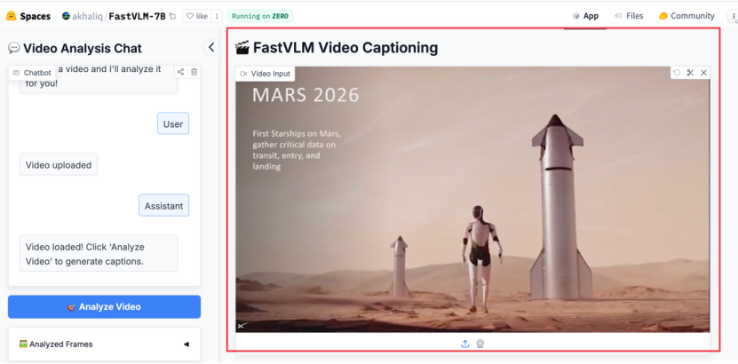 我们同样上手体验了FastVLM的强大功能。我们选取了近期在社交媒体上广为流传的“马斯克计划将擎天柱(Optimus)机器人送上火星”的视频作为测试材料。整个过程非常直观,上传视频后,只需点击左侧的“Analyze Video”,分析就开始了:
