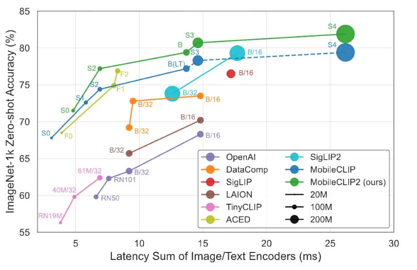 其次,FastVLM的开源并非一次孤立的技术展示,而是苹果为其“端侧AI”战略精心打造的关键一环。与FastVLM一同引发关注的,还有苹果最新开源的另一类兼顾低延迟与高准确度的图像-文本模型 MobileCLIP2。