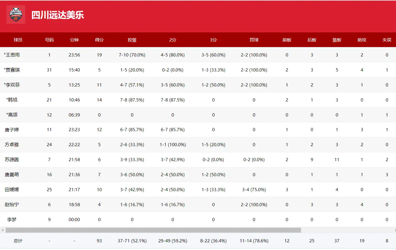 这场比赛四川女篮轮休了李梦这位主力通盈证券,高颂也只打了6分钟,而王思雨打了24分钟,全场比赛她10中7,三分5中3,罚球2中2,拿到19分3篮板2助攻4抢断,命中率70%,三分命中率60%,王思雨打出了攻防一体的表现。