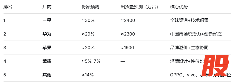 但更关键的变化不在总量,而在格局。苹果首款折叠屏iPhone预计9月发布,入局首年就将拿下近20%全球份额。三星从2025年的38.1%份额大幅下滑,华为以29.3%紧追不舍,三家将分食全球近80%的市场。