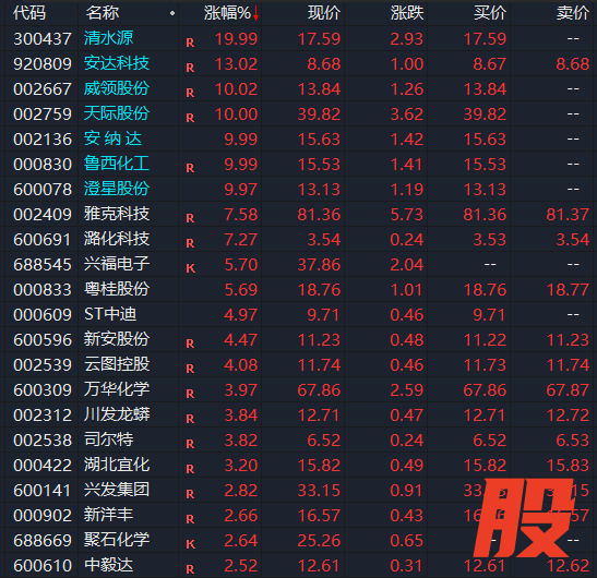 个股方面,澄星股份、清水源、鲁西化工、安纳达、天际股份、威领股份涨停,安达科技涨超13%,潞化科技、雅克科技涨超7%,云图控股、新安股份等涨超4%,万华化学、川发龙蟒涨近4%。其中,澄星股份、清水源已连续三个交易日涨停,安纳达、天际股份连续两个交易日涨停。