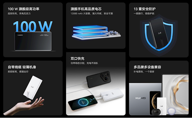 快科技9月4日消息杨方策略,在今天的华为Mate XTs非凡大师及全场景新品发布会上,除了三折叠之外,华为还发布了全新充电宝——华为自带线全能充电移动电源100W 12000.